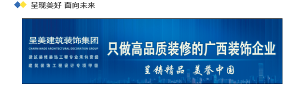 堅守匠心、品質(zhì)至上,守正創(chuàng)新、勇毅前行。呈美建筑裝飾集團將始終堅持以良好的口碑與信譽走在行業(yè)前列,繼續(xù)強化品牌影響力,為“廣西建筑裝飾”行業(yè)品牌建設,為廣西建筑裝飾行業(yè)改革和發(fā)展做出更大貢獻!